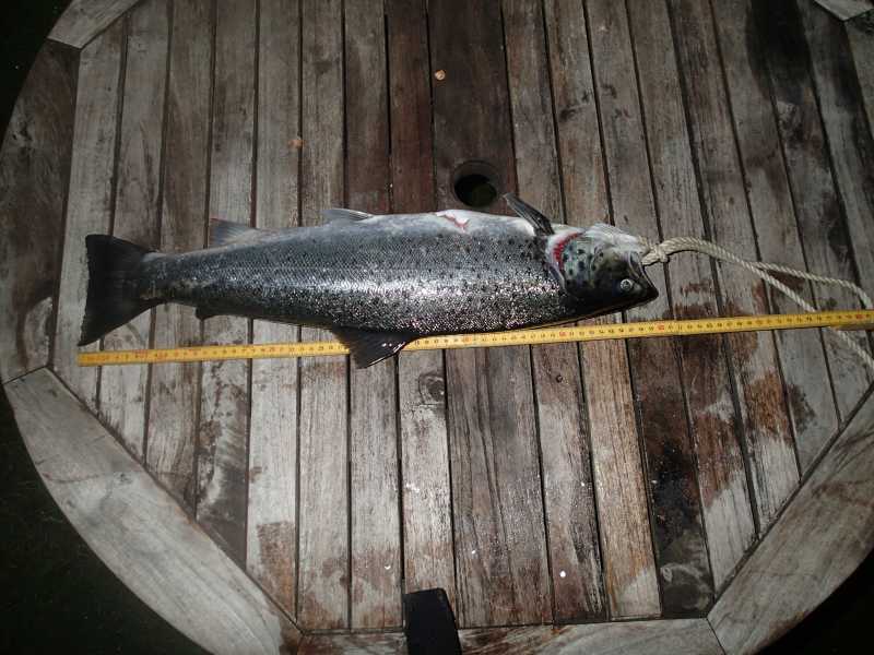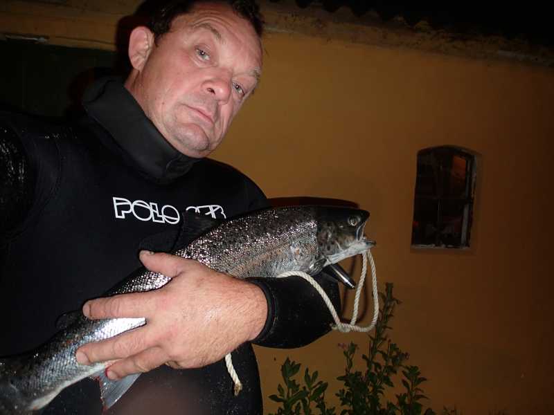 Ørred ca. 35 cm tiltrækkes af lyset og passerer langsomt under mig i en halv meters afstand. Den er for lille.Skyder kort efter 3 kg blank ørred på ca. 1 meter vand. Ser den i kl. 9 på ca. 4 meters afstand. Tiltrukket af lyset, begynder den at nærme sig ved at cirkle om mig. Skyder den i kl. 12 på 2 meters afstand, da jeg ikke tør vente længere. Rammer den for lavt og den slider en flænge i sig selv. Jeg bliver viklet ind i linerne, men formår alligevel at trække den til mig. Får fat om struben på den og beroliger den med et par slag med lygten. Jeg har skudt min første ørred – dagen er reddet.