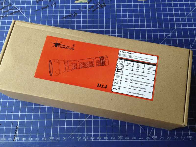 Købte den på en kinesisk hjemmeside til ca. 200 kroner.Den hedder SolarStorm DX4 og har 4 x XM-L LEDere og tager 2 x 18650 eller 2 x 26650 batterier.