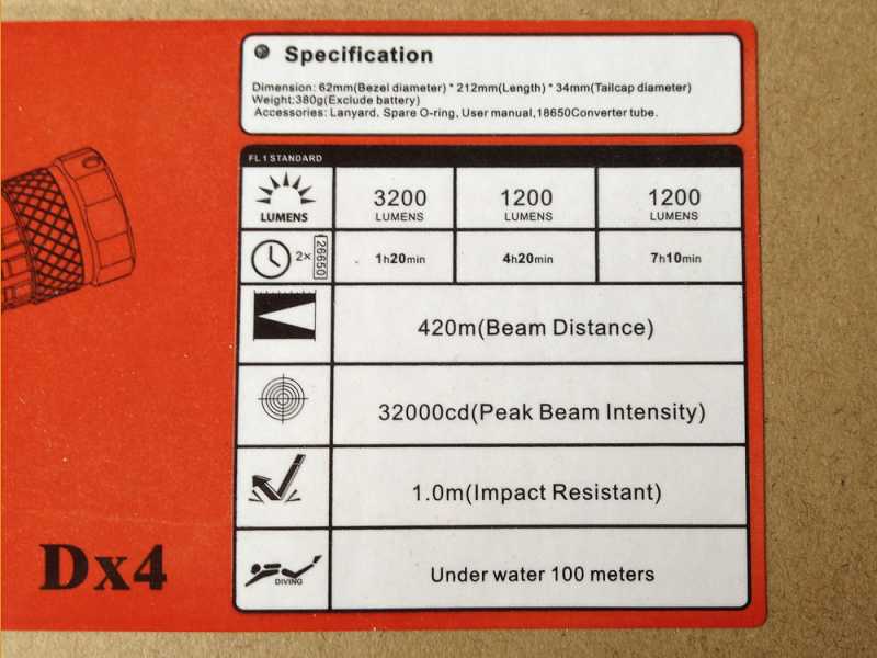Jeg har måske overset det, men jeg er ikke bekendt med, at Nitecore laver en dykkerlygte, som hedder D4. Derimod fremstiller de en oplader som hedder D4. Så vidt jeg ved, laver Nitecore to lygter til dykning (max 40m). Model SRT7 og SRT6. De har en opgivet max lumen på 960 lumen, som igen iflg. specs burde kunne holde i 1 time 45 minuter med brug af 1 stks 18650 batteri (optimalt med 3400mAh). Er det disse modeller, som du tænker på?