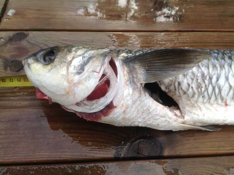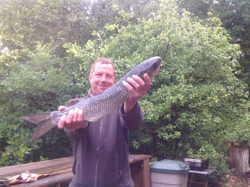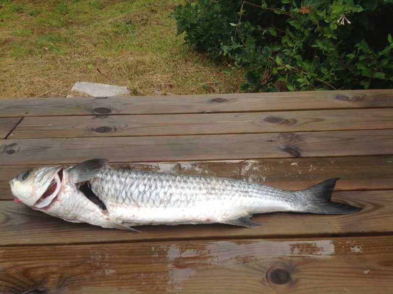 Jeg undskylder hentehåret og de tykke kinder, men efter 7 timer i vandet :woohoo: er man undskyldt. Hvis man ligger mærke til det store huld der er i Multen det er dens kamp for at komme fri, spyddet gled lige igennem hullet efter jeg havde fastgjort den til båden. Og som den skarpsindige læser jo jeg fil også et par pæne torsk den største på 48 cm.