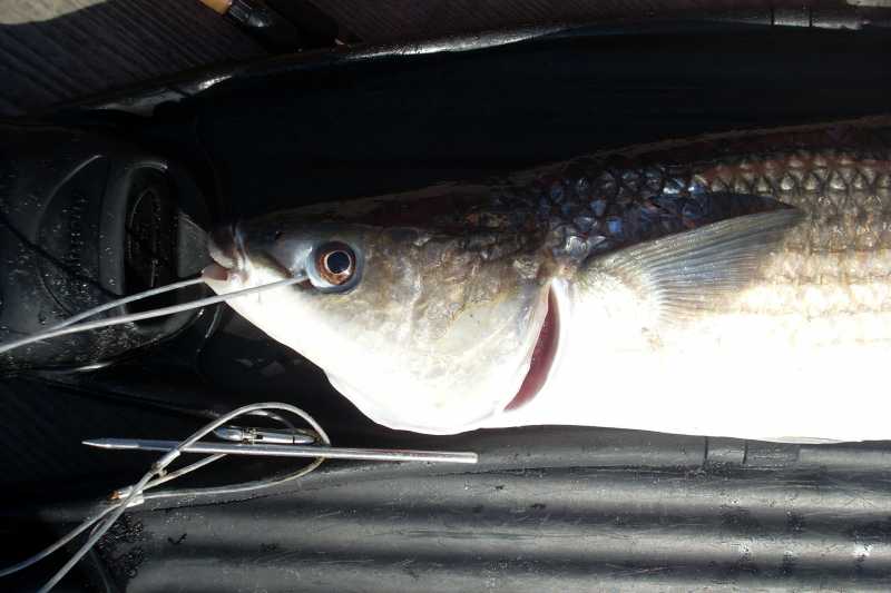 Indtil jeg kommer på en god ide så fortsætter jeg med monteringen på spidsen af harpunen, som er simpel og nem. Nu kunne jeg jo også lære at tage det lidt roligt når man rammer en fisk, meen denne Multe fætter var på speed eller et eller andet for den var sku vild.