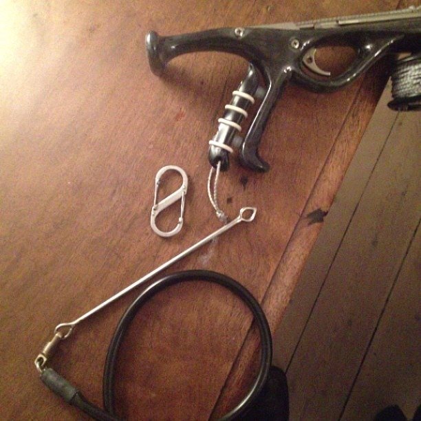 Min line er sat fast på bøjen med en karabin, derfra løber den gennem en D-ring på min drop vest, videre gennem en D-ring på mit blybælte, og ud til min harpun hvor den er fastgjort i en paracord-løkke, med endnu en karabin.