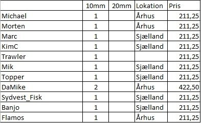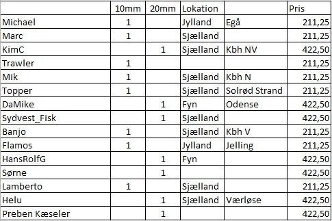 Så er vi klar, jeg at tilladt mig at pålægge alle 10 kr i admin gebyr (til bla. benzin til afhentning)Vil i indbetale jeres beløb vi mobilpay på 28444599, når alle har betalt, bestiller jeg og afhenter dem.