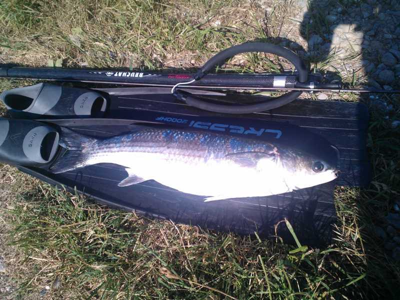 Formålet med turen var at tage min første multe, efter 2 min i vandet står der en KÆMPE fanden. Pulsen stiger og fisken står med siden til. Jeg skyder og rammer, multen går selvfølgelig totalt amok. Inde i hovedet er der panik, for hvad skal jeg nu? De flade er jo nemme, men hvad nu? I løbet af ganske kort tid vrister multen sig fri, jeg er skuffet og har overdrevet dårlig samvittighed.
