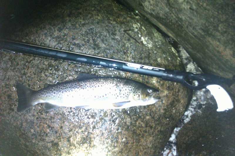 Så igår aftes klokken 23.30 startede jeg bilen op og kørte på østkysten, forventningsfuld og med en lidt urolig fornemmelse i maven. Det var vindstille, fuldmåne og lunt i vejret… Alt virkede perfekt. Vel ankommet mødte der mig en spejlblank overflade som skinnnede i fuldmånens skær alt var stille kun en svag skvulpen i vandkanten. Jeg fik hurtigt overdelen på, listede i vandet og fik fumlet dykkerfødder, maske og snorkel på…. Hvor fanden lagde jeg harpunen!??! Stak hovedet under vand på ca. 30-40 cm. vand og blev lidt overrasket over at jeg faktisk kunne se alt.. Og dér lå harpunen! Pyyyha.. Fik ladt den, tændt for lygten og gled ud i mørket. Og her blev jeg noget overrasket over lygten.. Jeg kunne se forbavsende “langt” frem og til siderne til trods for en del småpartikler! Fandt dog styrken på 75% bedst. Det myldrede med liv, torsk fra 10-30 cm. ål, flade, og stimer af små byttefisk. Jeg havde været i vandet i små 10 min. da jeg lader lygten glide hen over nogle tætte og høje stængler og pludselig kommer “flashet” fra en havørred fører hurtigt lygten henover igen.. Og jo den er god nok! Der inde imellem stænglerne står den og svejer svagt i strømmen.. Jeg skynder mig at flytte lygten så ikke jeg lyser direkte på den. Jeg får ført harpunen hen på den og i det samme begynder den at ane uråd og begynder at slå lidt med halen og glide dybere ind i skoven af stængler jeg skynder mig at holde fremme på hovedet af den og får lappet skuddet af i samme bevægelse.. Jeg aner ikke om jeg har ramt men få sekunder efter er jeg ikke i tvivl da jeg i lygtens lys ser min harpun line stramme op og det derefter rykker voldsomt i harpunen. Yes! Der er træf! Fisken var rundt i hele tangskoven og rundt om mig et par gange før jeg fik fat i den og sat kniven i nakken på den. Afstanden var små 2 meter og skuddet sad fint 3-4 cm. bag gælderne og lidt højt. 49 cm. og 1,2 kg. Jeg var pave stolt og lidt bange for at rive den af stringeren så svømmede efter 10 min. i land med den og vendte så tilbage til mørket igen for en sidste tur i modsatte retning. Her spotter jeg hurtigt en torsk på 50-60 cm. som kommer lige imod mig, den stiger op fra bunden dravet af lyset fra lygten åbenbart for den kommer helt op og glor ind i lygten på 15 cm. afstand glider forbi mig og lægger sig på bunden en halv meter fra mig. Jeg fører harpunen hen på den og skal til at skyde men fisken er mega tynd i forhold til sin længde.. Er nærmest “hulmavet” så jeg lader den være. Kort tid efter glider endnu en havørred ind i lygtens skær, den er kommet skråt bagfra, jeg får hold på den igen ca. 2 meter fra mig, skyder… rusk i line og harpun… Og så ingen ting… Kun en sky af små sølvskæl.. Øv øv! Nå beslutter mig for at holde for i nat og vender næsen mod land og kort tid efter skimter jeg en pæn havørred små 4 meter ude men den har bestemt ikke tænkt sig at lege med og stikker mod dybt vand.Kæmpe oplevelse på mit første natdyk… fed og lidt spooky fornemmelse men kan slet ikke vente til næste gang. 🙂