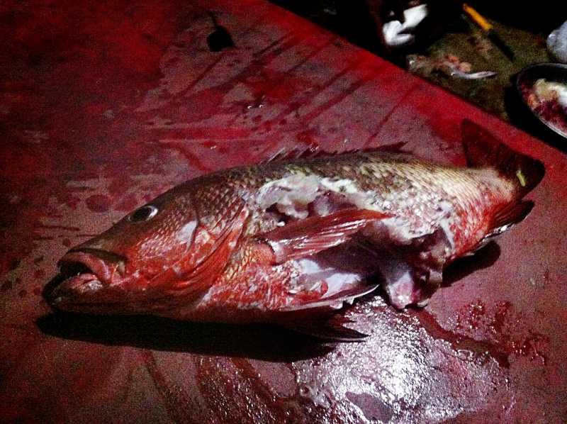 Jægeren prøver så at trække den ud, men skidtet sidder fast. Det ender med at han stemmer fødderne imod klippen på hver side af hullet, tager godt fat i skydelinen, og bruger ryggen og benene til at hale fisken ud. Det er så ikke blot fisken han har skudt som kommer ud, det gør en koloenorm muræne også, som er jævnt gnaven over at blive berøvet sin middag. Jeg kan ikke huske hvad der sker derefter, men der var ingen tvivl om hvem murænen holdt ansvarlig for tyveriet, og gerne tildelte lidt “reef justice” eller hvad man nu skal kalde det…Nå, men det er da altid noget at ham fyren, der fik sin fangst ødelagt ikke mistede mere. Der var jo f.eks ham der i ’05 som mistede en tommelfinger, og hvis en muræne kan lave sådan en ravage som på den snapper, så ka’ den sgu nok også ta’ en grim bid af så meget andet…