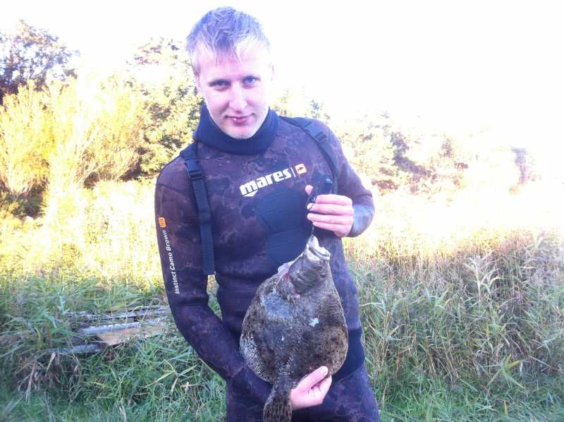 Vi havde svømmet ca. 2 km. fra spidsen på asnæs (Kalundborg) og indad, med god fangst af både flade og en pighvar. Så sker det så. en hel flok multer svømmer rundt på lavt vand. Vi skyder forbi mange gange. Lige inden vi går op, prøver jeg en sidste gang på lavt vand. Der går ca. 3 min. og så er den der. Bag det høje tang, trisser en multe rundt. jeg drejer kanonen.. venter… den svømmer mod mig.. venter.. den blotter siden… venter.. venter,, Bang! så var den der!