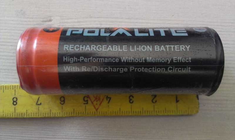 Gecko havde ret. Der er tale om et 26650 LiOn batteri – og ikke et 18650, som jeg først antog. Specs på batteriet indikerer, at der er tale om et 5000mAh beskyttet batteri.