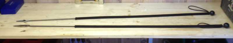 JensDeltagerJeg har lavet to spyd af M6 gevindstang i syrefast rustfri og et par meter stofbetrukket brændstofslange, trukket ned til 25 cm fra spidsen. Jeg købte en to pk harpunspidser, med 6 mm gevind og det var det.