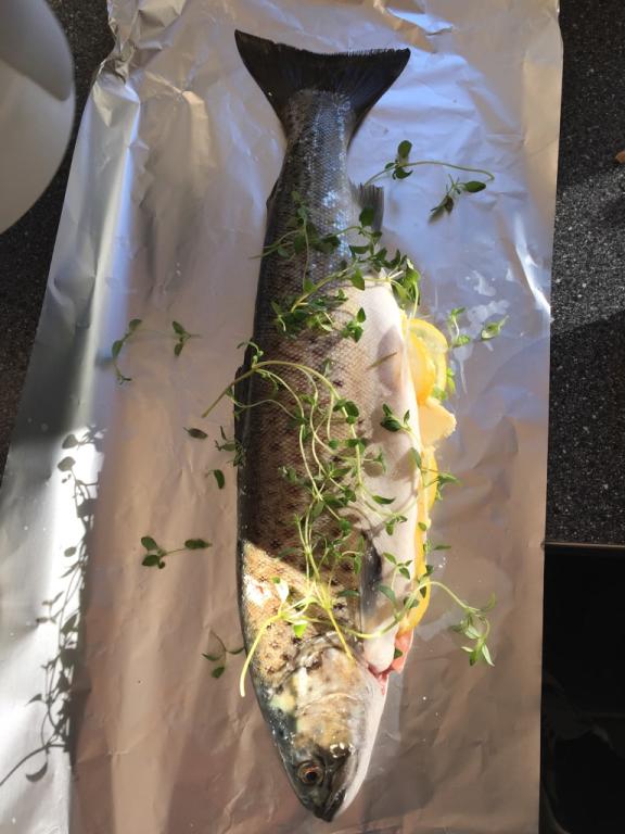 Begge fisk havnede på grillen i staniol søndag aften, med frisk timian, citroner, salt og smør.