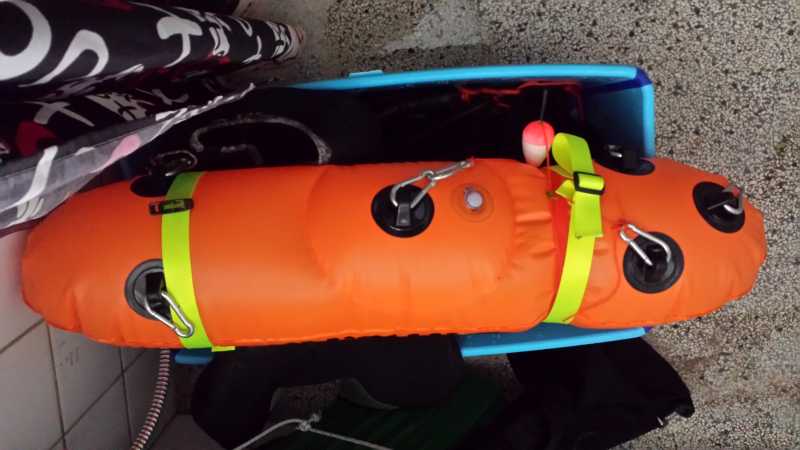 Mit eget set-up er frygteligt simpelt. Den efterhånden klassiske Okapi 2 bøje/flåde, en håndfuld karabinhager og snap klemmer, en stringer, en skulderrem og en kraftig elastik til at fastgøre mine finner under gåturen til vandet udgør mit basic set-up. I lommen har jeg normalt et par musli bars, en flaske vand, en pandelampe og et kompas.