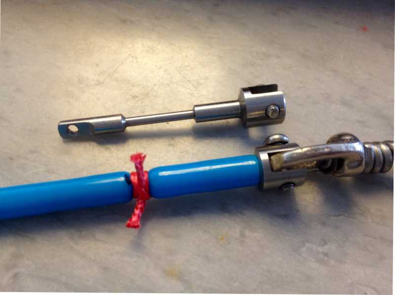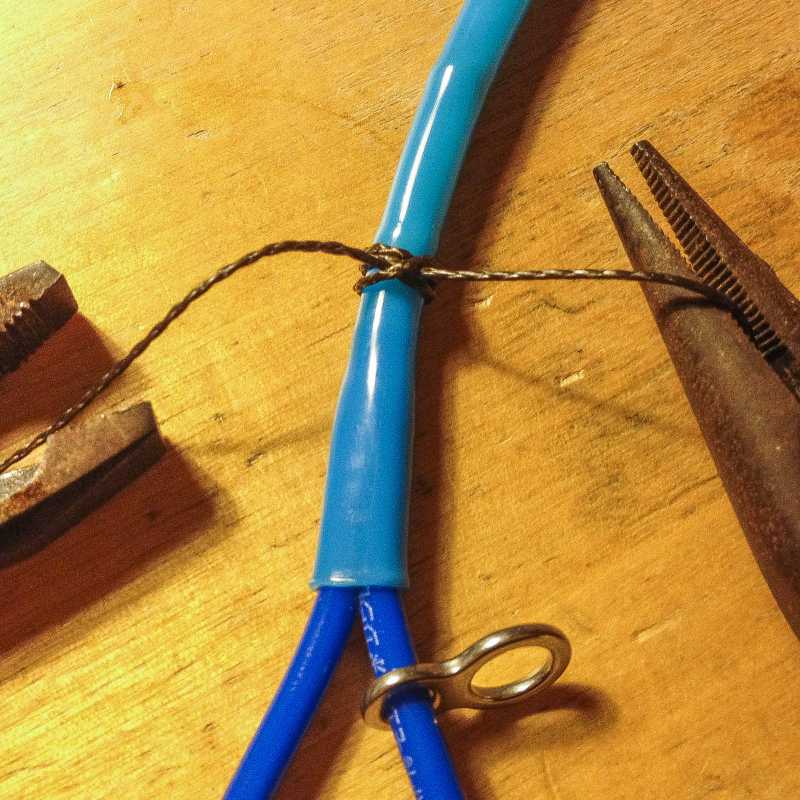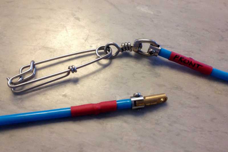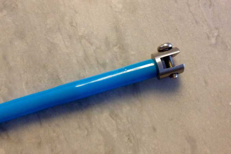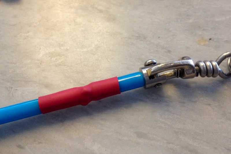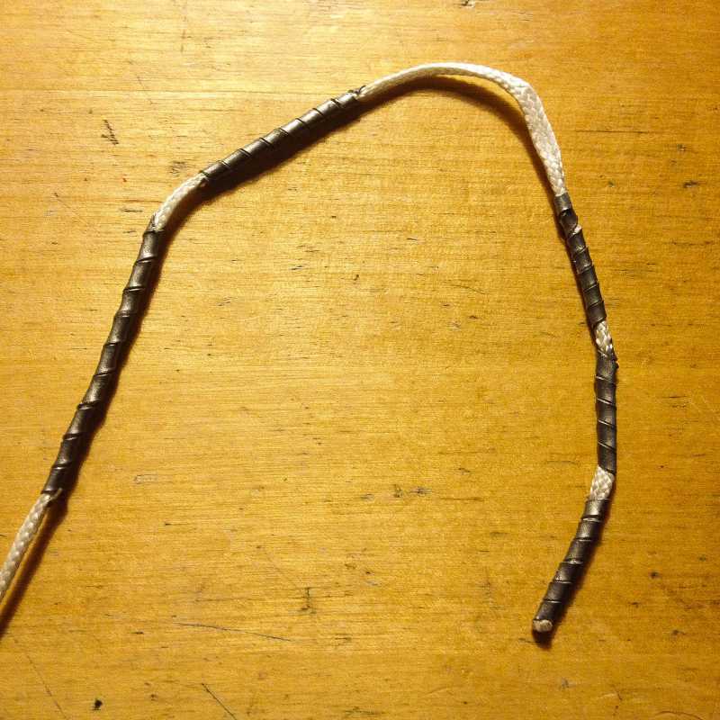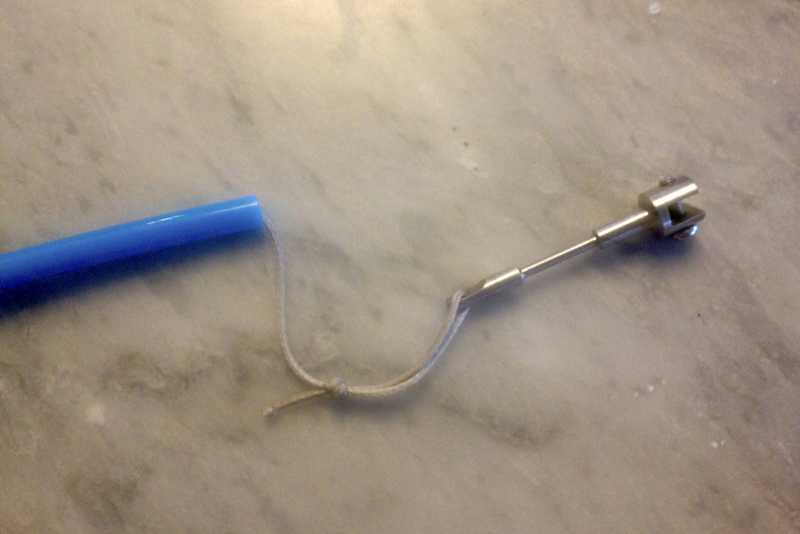 Lidt bly viklet omkring 2mm Dyneemaen, så jeg kunne få den igennem PU-slangen