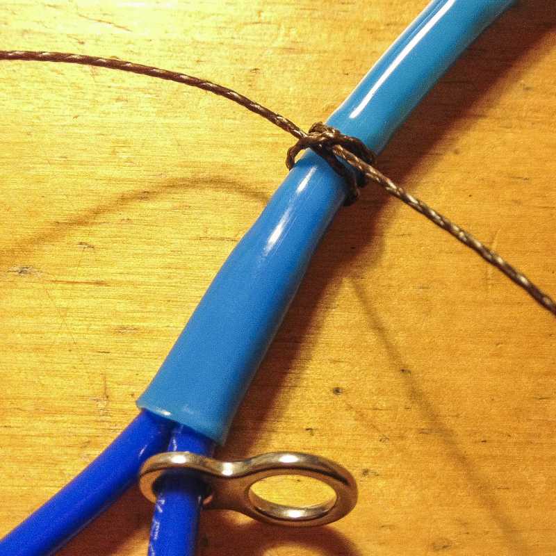 Besnøring på ydersiden (mod loopet/enden af linen) af inderkernens knuder, så dyneemaen ikke trækkes ud af PU-slangen