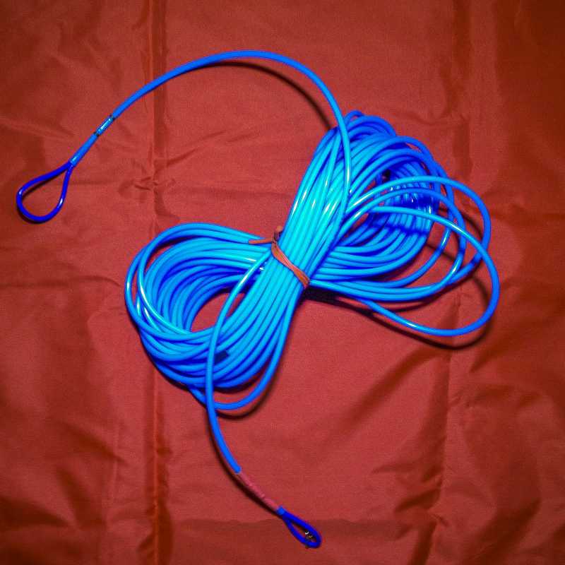 Den er 20m lang, har 2mm Dyneema som kerne og en PU-slange på 4x6mm.