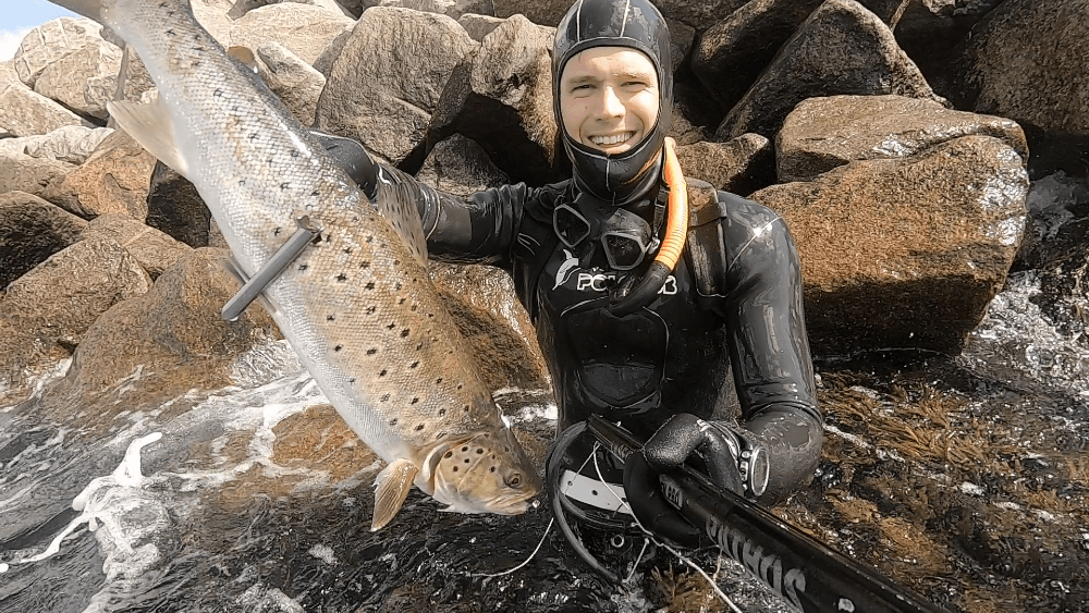Et kort eftermiddagsdyk i sommervarmen resulterede i en havørred. Jeg lå aspetto for foden af molen, og ventede på at fisken kom cruisende forbi. Jeg var meget heldig, og på mit allerførste dyk, kom en havørred snigende op bag mig. Jeg nåede akkurat at få vendt harpunen i tide, og et hurtigt skud mod midten af kroppen sikrede fisken.