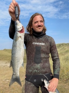 Efter kort tid ser jeg den første multe. Jeg plejer altid at holde mig rolig i vandet men jeg panikker og skyder efter den fra overfladen og rammer ved siden af. Skud fra overfladen er svære og især når der er lidt dønninger som i dag. Imens jeg lader min harpun kommer 6 multer svømmende forbi mig. Der går lige et par minutter før jeg får ro på og med tiltro om at jeg nok skal fange en multe, kommer jeg ind i mit stille mode igen. “Ingen panik – tag det roligt”.