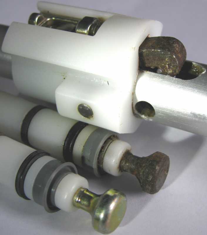 Jeg har tænkt mig at tage det igen med Søren fra Sportsbutikken for hvilken løsning der kan komme ud af det. Dog er en ting sikkert, de bliver nød til at skifte legering.På billede kan man se hvordan rusten giver skaller der kan falde af og give ridser i Aluminiumsrøret hvor stemplet køre, og efter hånden give ridser der kan gøre den mere og mere utæt med tiden, med mindre den når at ruste fast først.!